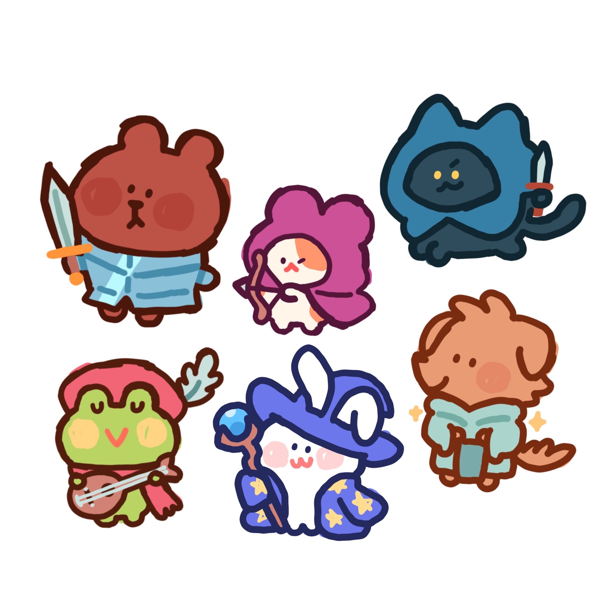 ★ characters: knight bear, archer hamster, thief cat, bard frog, wizard bunny, healer dog