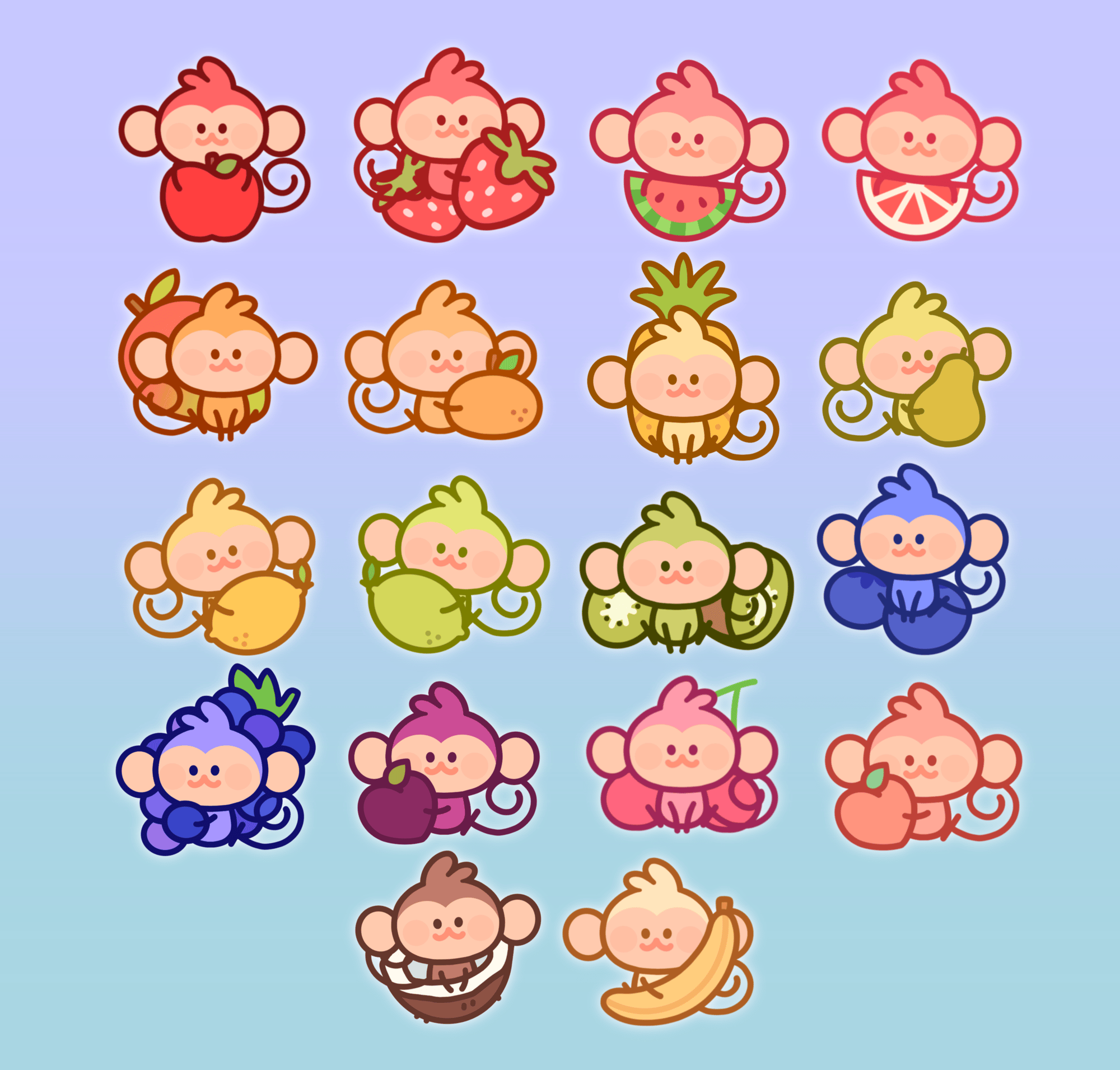 mmmmm... monkeys: apple, strawberry, watermelon, grapefruit, mango, orange, pineapple, pear, lemon, lime, kiwi, blueberry, grape, plum, cherry, peach, coconut, banana